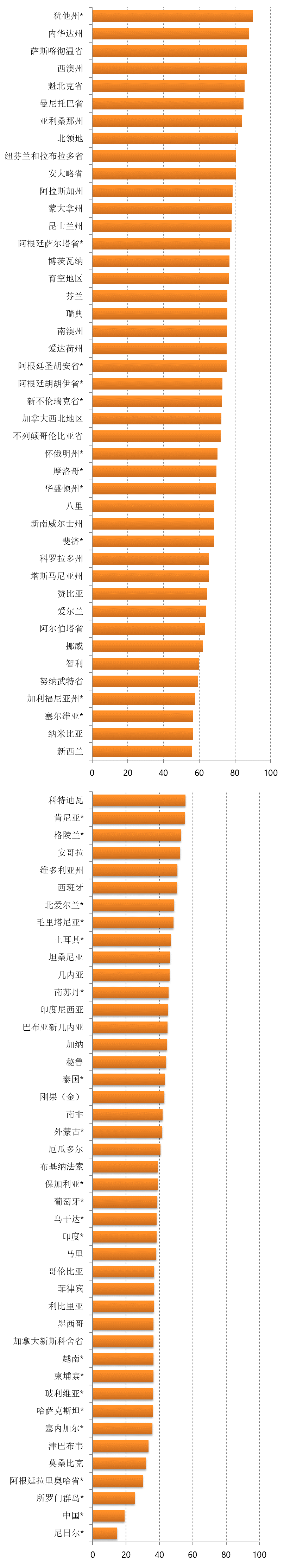 榜单前列多为美国、加拿大和澳大利亚的省州,前十依次是美国犹他州、内华达州、加拿大萨斯喀彻温省、澳大利亚西澳州、加拿大魁北克省、曼尼托巴省、美国亚利桑那州、澳大利亚北领地、加拿大纽芬兰和拉布拉多省及安大略省。