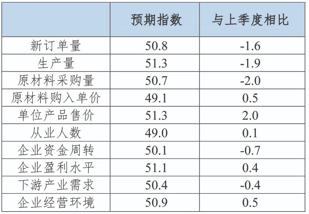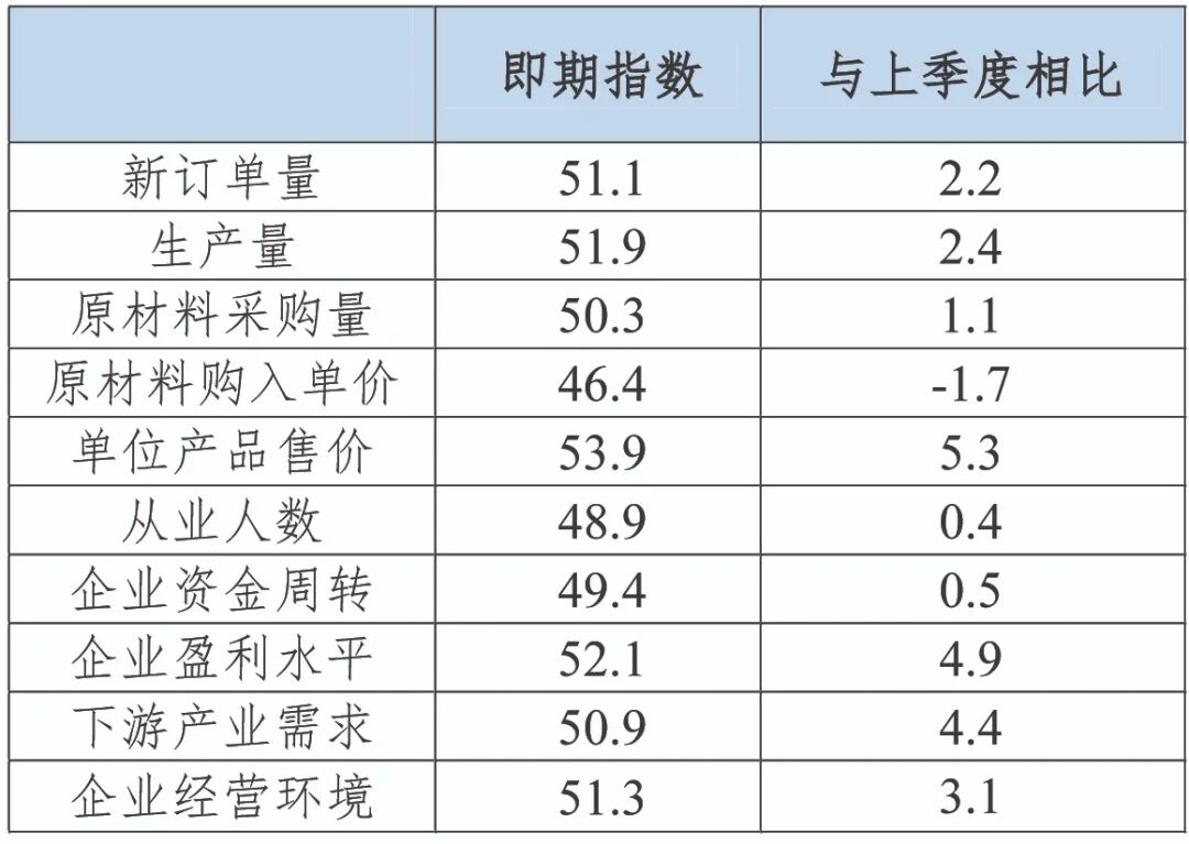 二季度,预期指数为50.6,较一季度回落0.2个点。由表2可知,10项指标中8项指标位于临界点50以上,5项指标较一季度出现上升,幅度较明显的前三位是单位产品售价、原材料购入单价和企业经营环境,分别上升2.0、0.5和0.5个点;5项指标出现回落,分别是新订单量、生产量、原材料采购量、企业资金周转和下游产业需求。