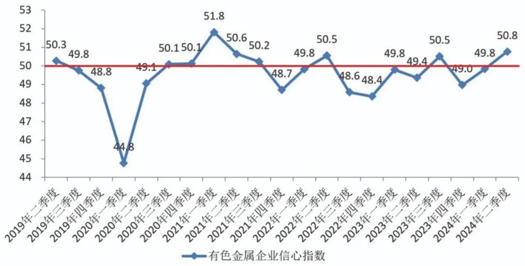 综上分析,二季度,有色金属企业信心指数较一季度出现明显好转,二季度信心指数为50.8,上升0.9个点;7个分项指标高于临界点,5个指标比一季度有所上升,说明有色金属企业对市场信心明显增长。企业信心提升主要表现在3个方面:一是单位产品售价指标较一季度上升5.3个点,幅度最大,表明当前有色金属产品的市场需求较为旺盛,企业盈利能力有所增强;二是企业盈利水平也得到了较大提升,即期指数显示企业盈利水平较一季度上升4.9个点,反映了有色金属企业在当前市场环境下经营状况良好,盈利能力有所提高;三是下游产业需求增加,即期指数较一季度上升4.4个点,这为企业提供了更广阔的市场空间,有助于企业扩大生产规模,提高市场占有率。此外,企业经营环境指标也得到相应提升,这为企业提供了更加稳定的发展环境,有利于企业长期发展。
