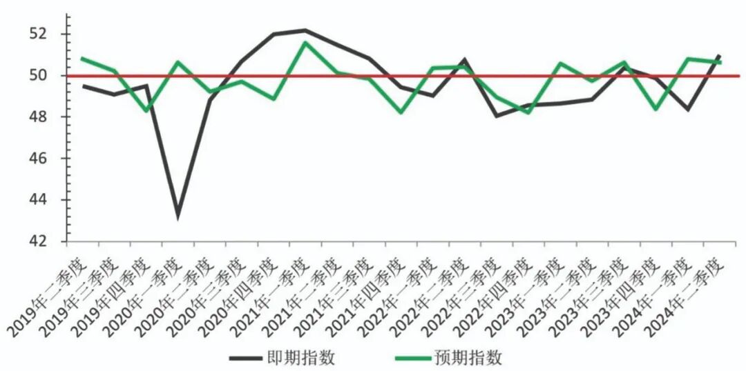 2024年二季度,有色金属企业信心指数为50.8,高于临界点50,比一季度上升0.9个点。二季度即期指数为51,较一季度上升2.6个点;预期指数为50.6,较一季度回落0.2个点。自2023年四季度以来,信心指数已连续2个季度持续上升,且即期指数上升幅度较明显,这显示出有色金属行业发展的积极态势。但是,二季度预期指数出现微幅回落,标志着企业对未来市场发展存在一定的不确定性。具体情况详见图1和图2。