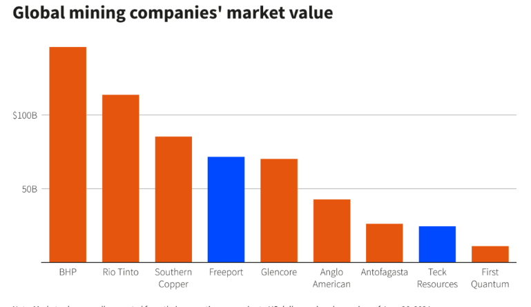 泰克资源之所以诱人,原因更为明显。根据分析师使用Visible Alpha数据的估计,到2028年,泰克的铜产量可能会翻一番,达到近60万吨。泰克资源预计2025年铜的EBITDA利润率为60%,超过自由港的45%。虽然科威尔家族(Keevil family)对股东数量施加强力的控制,但其特别投票权股份将在5年后转为普通股。在完成将泰克的炼钢煤炭业务出售给瑞士竞争对手嘉能可之后,泰克将成为一个极具吸引力的目标。