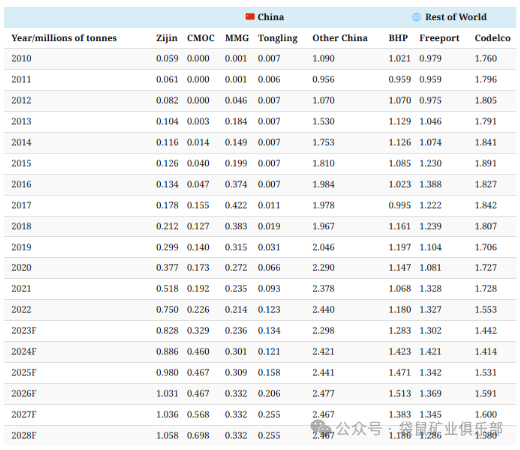 根据基准矿产情报机构(Benchmark Mineral Intelligence)的数据,预计到 2025 年,中国矿商的铜产量将超过三大生产商,总产量将达到 440 万吨,而智利国家铜矿、必和必拓和自由港的总产量为 430 万吨。