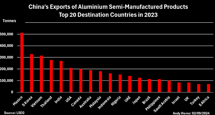 尽管太阳能电池板和电动汽车等新能源应用的需求仍然具有弹性,但建筑业和更广泛的制造业疲软限制了国内需求。剩余的铝以板材、棒材、管材和箔材等半成品的形式出口。