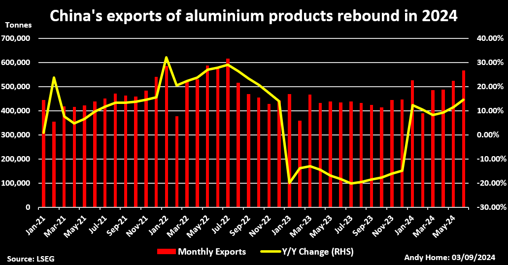 产量及出口数量持续高增根据国际铝业协会的数据,中国 7 月份的原铝产量创下 369 万吨的新月峰值。2024 年前 7 个月的产量同比增长 4.9%,7 月份集体开工率达到年化 4350 万吨。中国的生产率正在接近政府规定的 4500 万吨年产能上限,因为水资源丰富的省份云南的降雨量增加使冶炼厂能够重启今年早些时候闲置的产能。