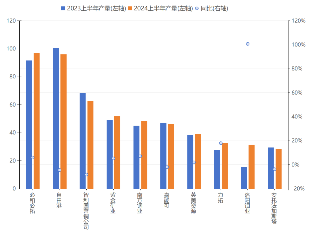 矿铜产量方面,2024年上半年,全球前十家铜矿企业矿铜产量合计534.7万吨,同比增长4.1%,占上半年全球矿铜总产量的48.0%。 具体来看,上半年,紫金矿业的卡莫阿-卡库拉三期选厂提前半年投产、塞尔维亚佩吉铜金矿上半年采掘的矿石品位较高,矿产铜产量51.9万吨,同比提高5.3%。墨西哥集团旗下南方铜业上半年矿铜产量48.3万吨,同比提高7.1%,主要增长来源于其位于秘鲁的Toquepala矿山上半年开采矿石品位与选矿回收率提高。英美资源的Los Bronces和El Soldado铜矿产量较低,Quellaveco铜矿的矿石品位也有所降低,但其Collahuasi矿山上半年铜产量同比增长9%,抵消了这部分影响,上半年英美资源矿产铜产量为39.4万吨,同比增长2.0%。必和必拓的Escondida铜矿实现了四年来的最高产量,其Spence铜矿、Carrapateena铜矿也都创下产量记录,必和必拓上半年矿铜产量同比提升了6%,2024财年(2023年7月-2024年6月)矿铜产量同比提升9%。 智利国营铜公司由于其在智利北部的Radomiro Tomic矿山长期停工、Rajo Inca铜矿的延迟投产,以及恶劣天气的影响,矿铜产量同比下降8.2%。嘉能可的Collahuasi铜矿与Antamina铜矿的矿铜增量未能弥补其在刚果的Mutanda铜钴矿和位于秘鲁的Antapaccay铜矿因频繁扰动造成的产量下降,上半年矿产铜产量同比下降2.0%。安托法加斯塔上半年矿铜产量也因为其在厄瓜多尔的Centinela铜矿开采矿石品位较低而同比下降3.7%。 从同比增幅来看,得益于TFM混合矿项目全面转入运营期、产能达45万吨铜,以及KFM保持年产15万吨铜满产的良好运营状况,洛阳钼业上半年完成矿铜产量31.4万吨,同比增长100.7%。力拓在其Escondida矿山上半年矿铜产量同比增长12%、Oyu Tolgoi铜金矿矿铜产量同比增长23%的加持下,同样实现了同比18%的产量增长。图1 2024年1-6月全球前十铜矿企业矿铜产量(单位:万吨铜金属,%)