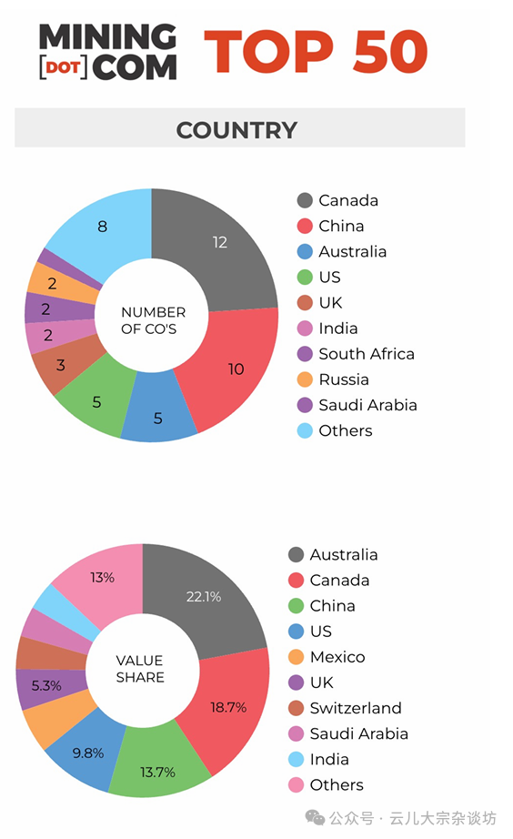 2024年末美元的强势进一步加剧了这些公司的损失。矿业杂志的TOP 50榜单是基于美元市值计算的,而非本地市场的股票价格变动。