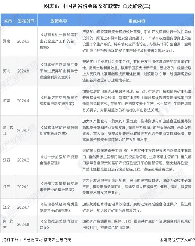 除了中共中央、国务院等部门颁布一系列政策外,各省市同样出台了一些举措来指导金属采矿行业的发展。主要方向为加强金属矿产保障力度,发展绿色矿山,促进金属采矿智能化升级等。