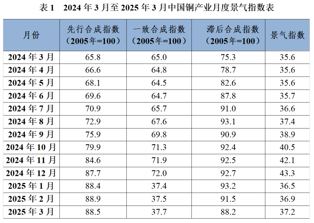 中国铜产业月度景气指数监测模型结果显示,2025年3月,中国铜产业月度景气指数为37.2,较上月上升了0.3个百分点,继续保持在“正常”区间运行;先行合成指数为88.5,较上月下降了0.4个百分点。最近13个月中国铜产业月度景气指数见表 1。