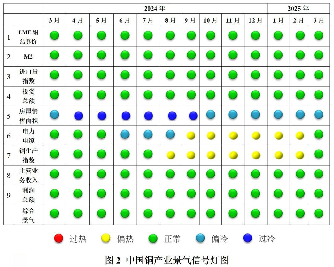 由图2中国铜产业景气信号灯可见,2025年3月份,在构成中国铜产业月度景气指数的所有9项指标中,共8项指标位于“正常”区间,房屋销售面积指标处于“偏冷”区间。