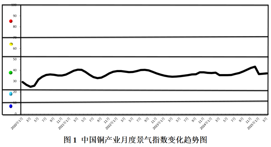 2025年3月,中国铜产业月度景气指数为37.2,较上月上升了0.3个百分点,位于“正常”区间运行。中国铜产业月度景气指数变化趋势如图1所示。