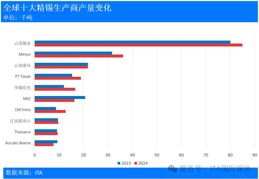 亚洲地区无疑是全球精锡生产的中心。在2024年的前十榜单中,亚洲企业占据了七席,合计产量达到17.78万吨,占十大生产商总产量的约75.8%,占全球总产量的约47.8%。