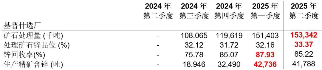 基普什选厂破纪录共处理矿石15.3万吨,生产精矿含锌4.2万吨,接近最高纪录;预计2025年下半年锌产量将显著提升