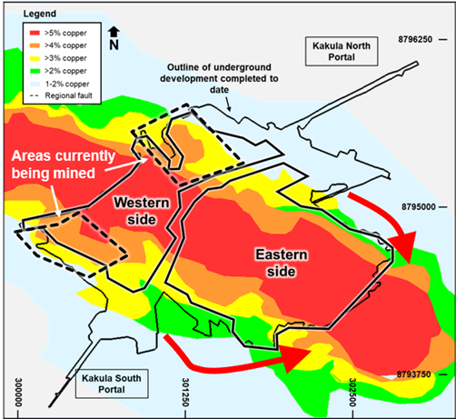 图2:卡库拉矿山井下基础设施的示意图,显示铜品位分布以及东区新采区拟建的两条主巷道的位置 (红色箭头)