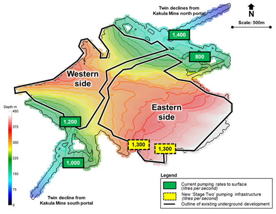 图1:截至2025年6月,卡库拉矿山井下基础设施示意图,显示矿山东、西区的深度以及第一阶段现有和第二阶段将新增的垂直抽水位置