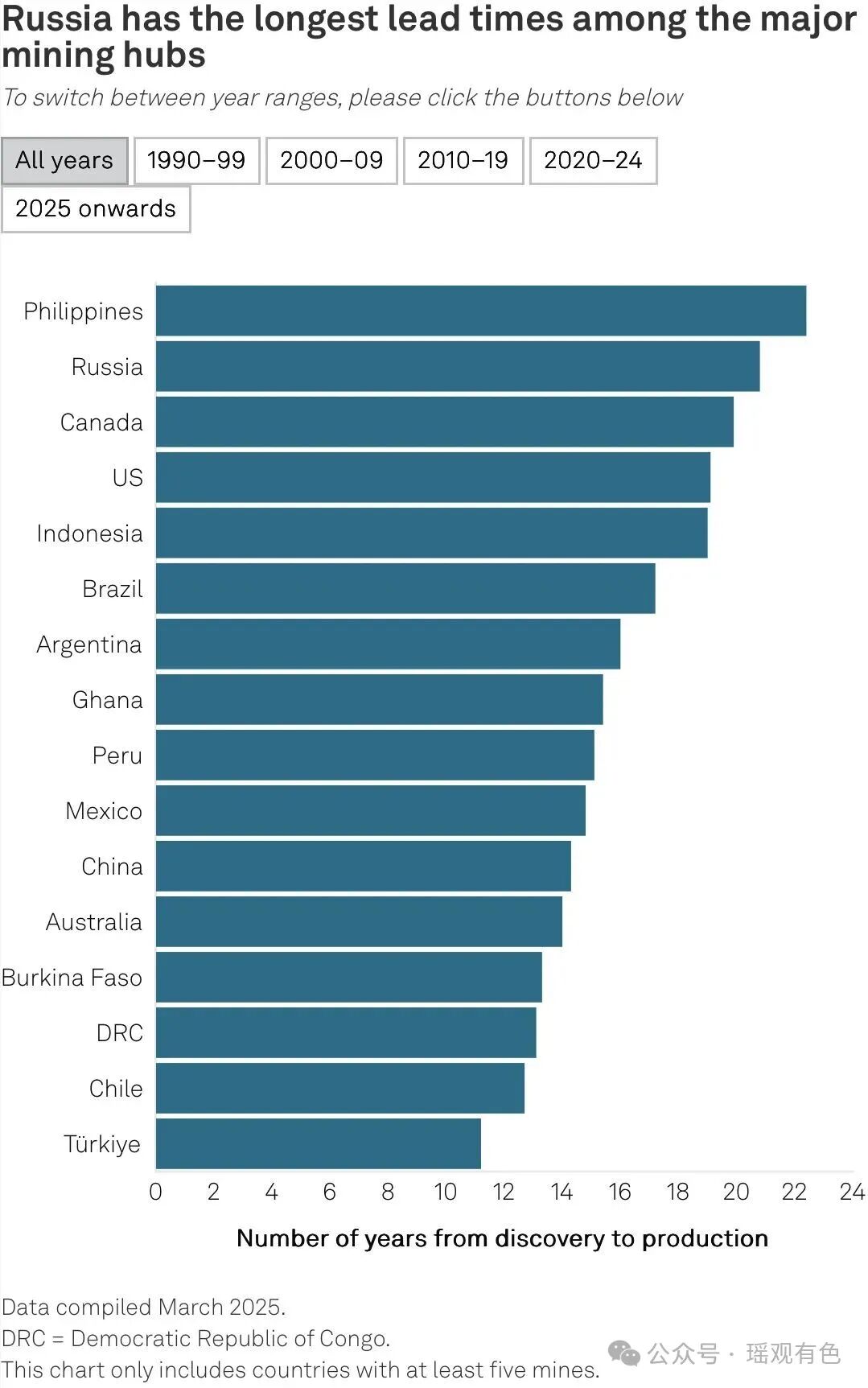 地域层级上,菲律宾和俄罗斯矿山开发周期最长,土耳其、智利和刚果金最短。