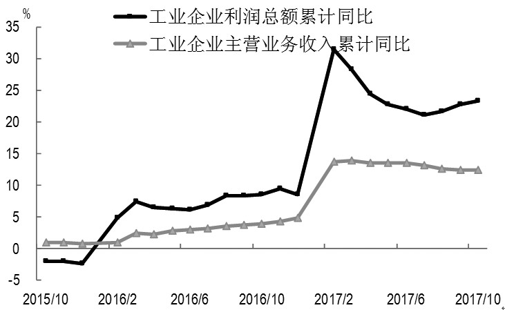 周一,国家统计局公布的10月规模以上工业企业利润增速为25.1%,不及前值的27.7%。受电力、热力利润回落影响,增速小幅回落。分行业来看,由于PPI高位滞涨以及基数效应,上游行业利润累计增速放缓,下游行业利润增速近几个月来维持平稳,中游行业利润增速亦略有改善。可见,供给侧改革利多上游企业利润修复,但成本上升对中下游行业利润的拖累明显低于预期。整体上看,产业企业利润增速仍维持在相对高位水平,显示债市利率回升等因素对实体的冲击尚未显现。