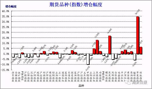 本周一,商品大多数增仓减仓各半,增仓幅度居前的是苹果,34.75%、焦炭,16.86%、焦煤,12.9%;减仓幅度居前的是甲醇,9.67%、锰硅,5.52%、丙烯,5.07%。