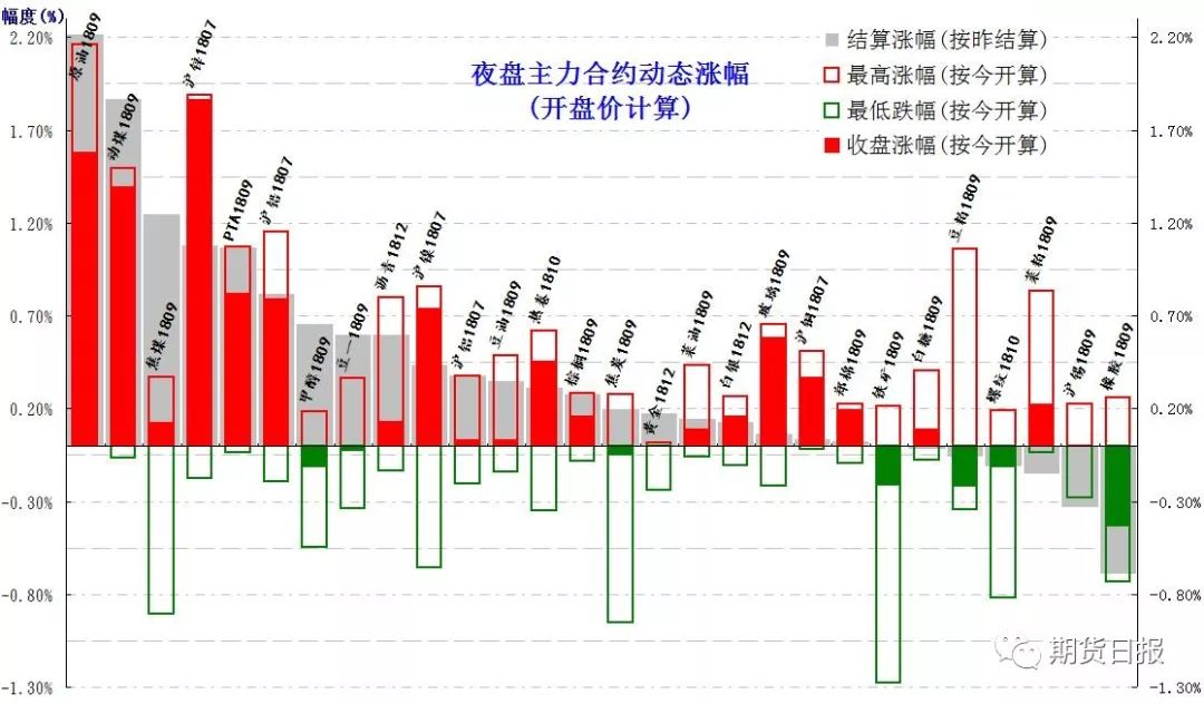 1.上周六美股收高;标普涨1.28%;道指涨1.39%;欧洲Stoxx50指数涨0.48%;美元指数涨0.15%;伦铜跌0.29%;原油涨1.99%;黄金涨0.25%。美豆跌1.58%;美豆粉跌1.38%;美豆油跌0.13%;美糖跌1.45%;美棉涨2.86%;CRB指数涨0.57%;BDI指数涨0.58%。离岸人民币CNH跌0.18%报6.3552;德银X-Trackers嘉实沪深300中国A股ETF跌0.07%。上海原油1809涨2.22%。美国石油基金USO涨1.92%。
