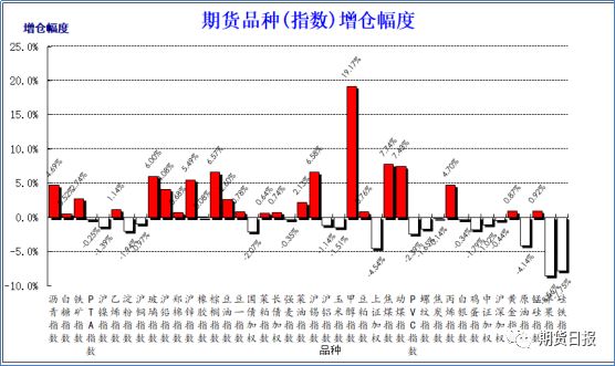 上周五,商品大多数增仓,增仓幅度居前的是甲醇,19.17%、焦煤,7.74%、动力煤,7.43%;减仓幅度居前的是苹果,8.56%、硅铁,7.75%、上证50,4.54%。